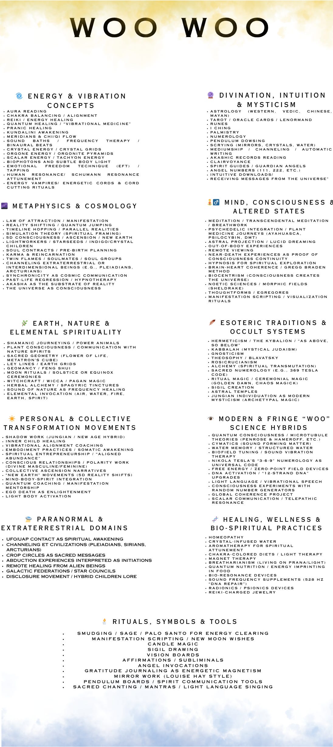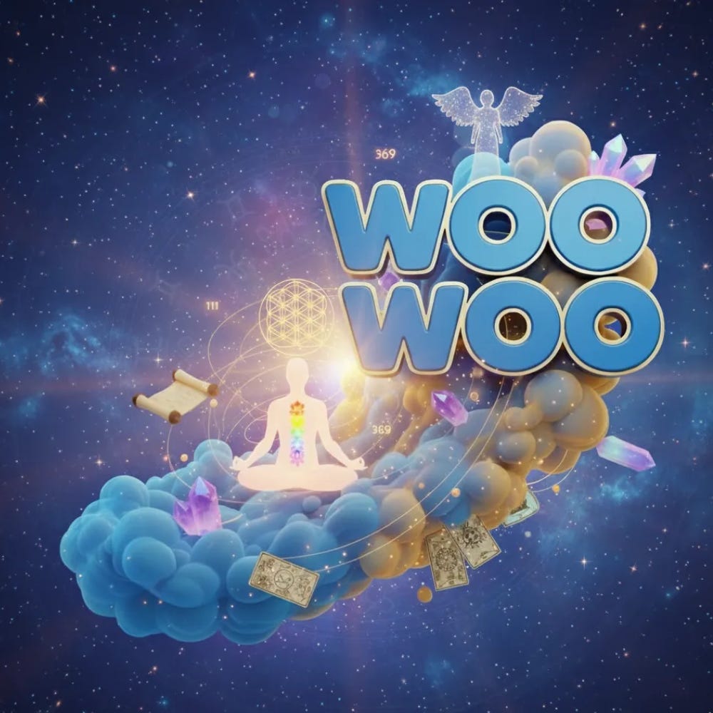 Woo woo ideas are always evolving, and therefore there’s not an exhaustive list. What makes the woo woo list today might be mainstream tomorrow. That said, I had AI help me craft a long list of woo woo ideas. I sifted through it, but I will say, I’m not versed in most of these ideas. I erred on overinclusion. I know that there are some items that are far more mainstream than others, and therefore placing them on a list together can seem like they invalidate those items. While surely frustrating, it also alludes to the point of this piece. I hope that we can see past the label and give each their due.