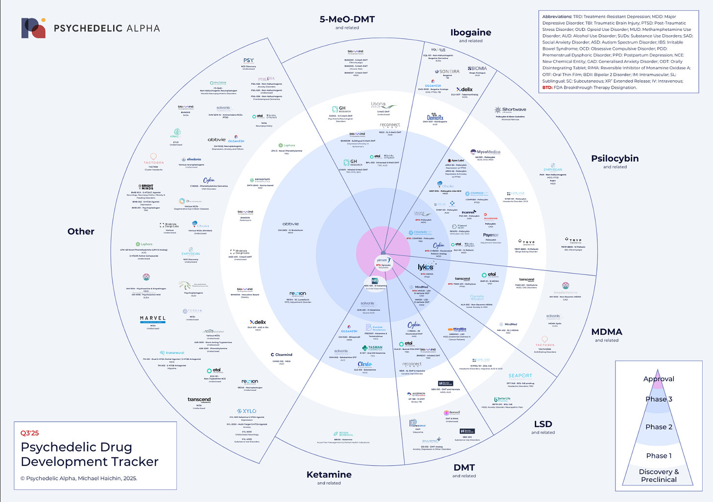 My wife and I were sitting in a nice workspace waiting for our car to be serviced. She showed me this chart of the FDA approval status of incoming psychedelic medicine, categorized by psychoactive substance. I mean, look at this.